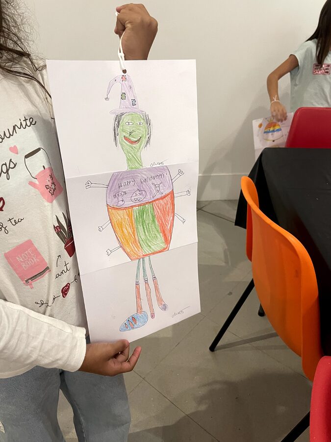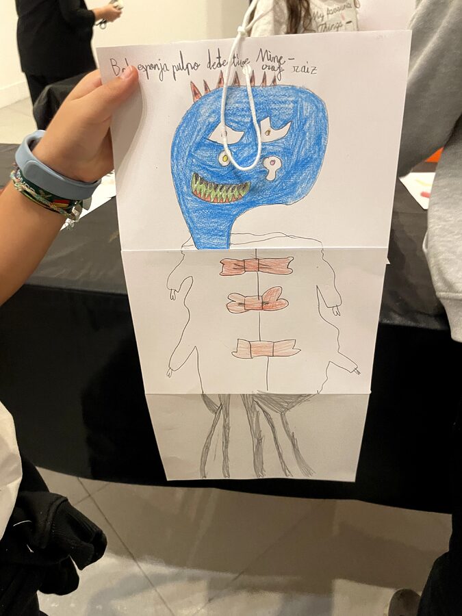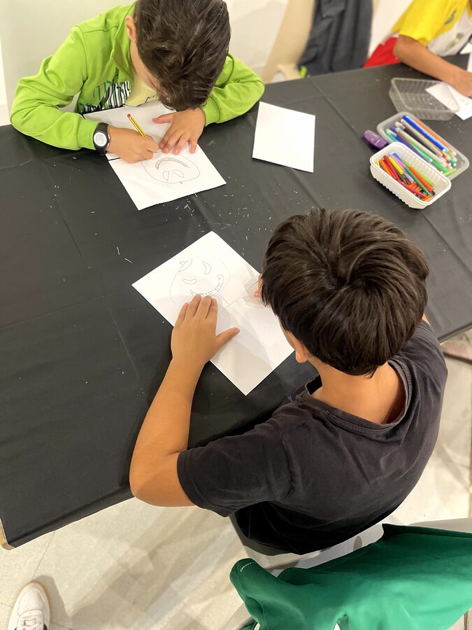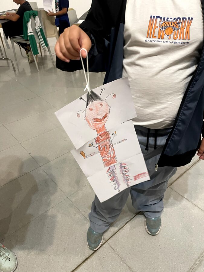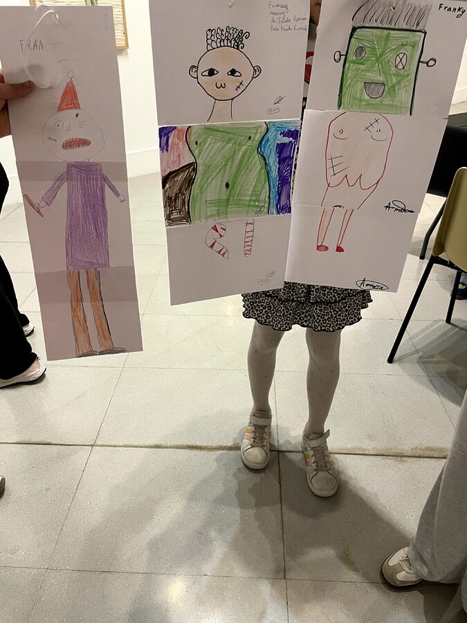 Inspirándose en su trabajo, el alumnado participó después en un divertido y original taller de “cadáveres exquisitos”. Cada estudiante dibujó una parte del cuerpo —cabeza, tronco o extremidades— sin ver el resto de la figura. Posteriormente, intercambiaron sus dibujos entre compañeros para crear personajes sorprendentes, creativos y llenos de imaginación.