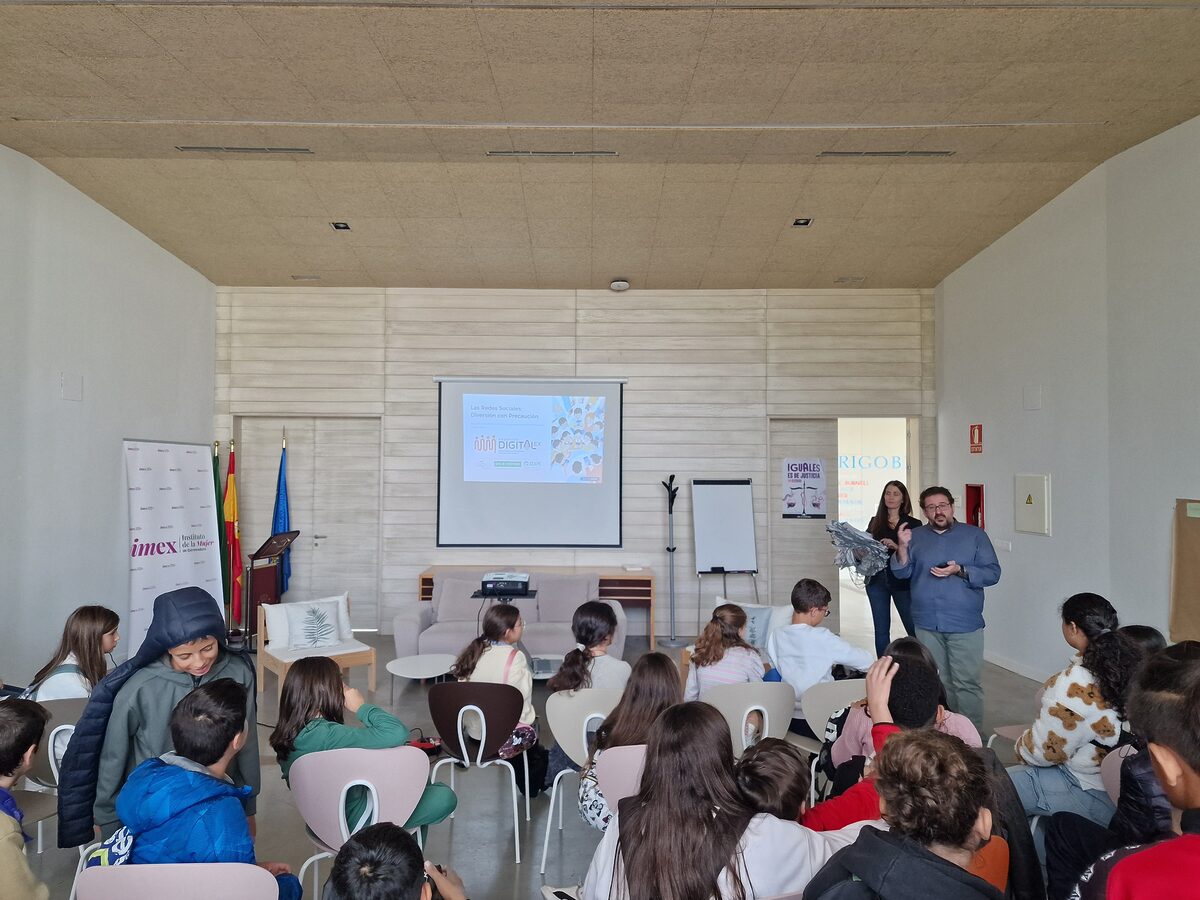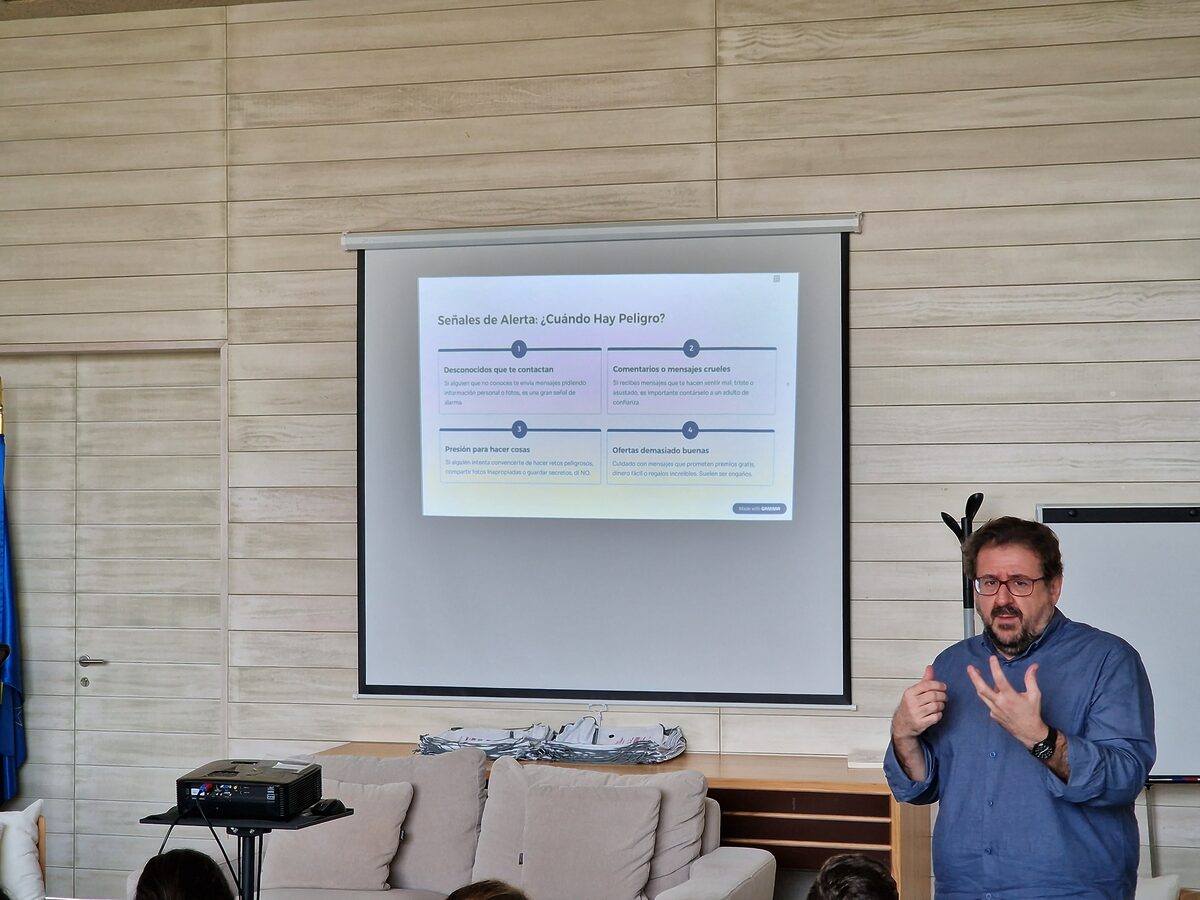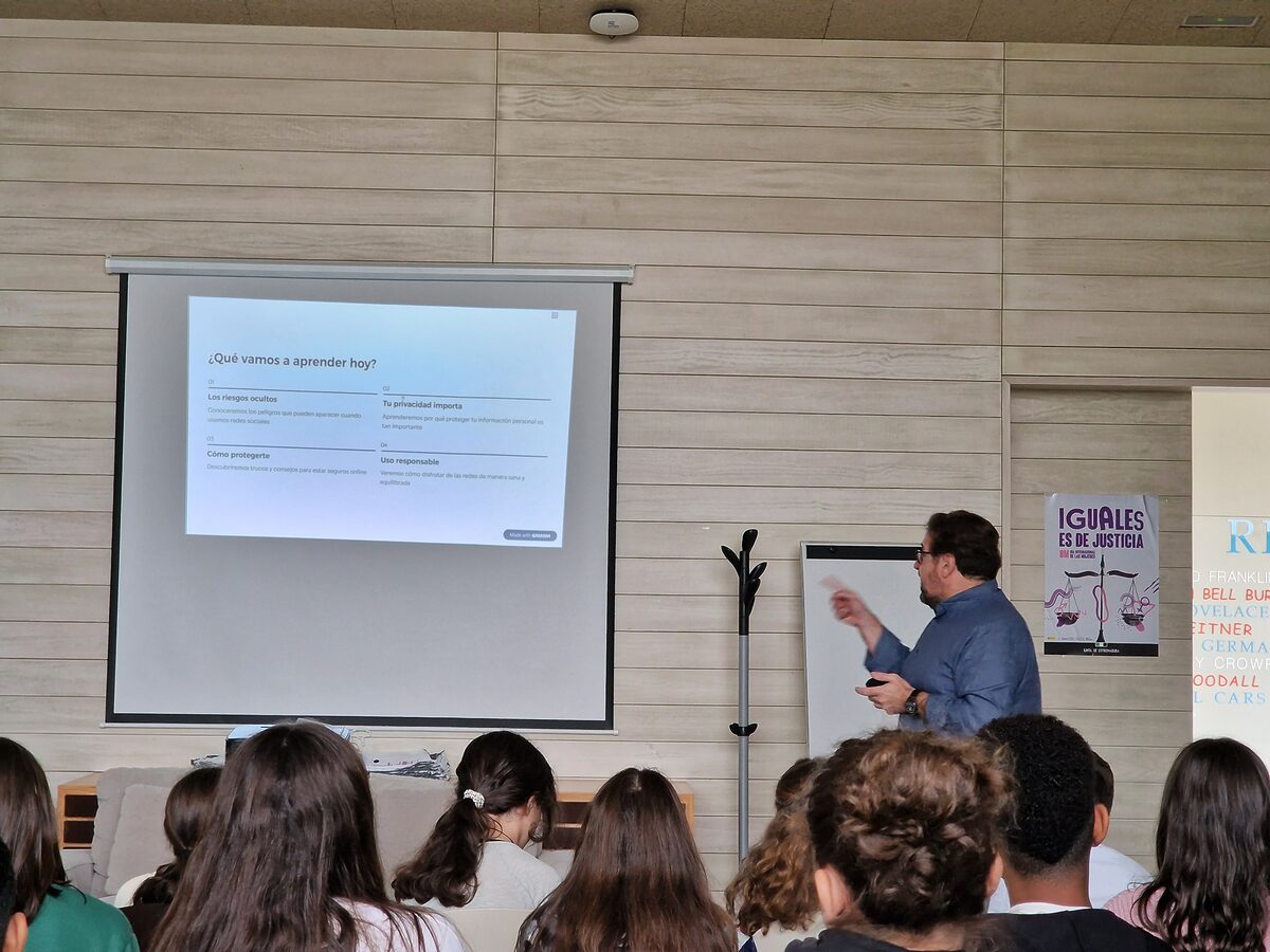 La jornada continuó con una charla sobre el uso responsable de Internet y las redes sociales, impartida por un técnico de Espacios Digitalex, dentro de la Red de Centros de Competencias Digitales de Extremadura (AUPEX, SEXPE y Junta de Extremadura). Bajo el título “Las redes sociales: diversión con precaución”, el alumnado aprendió a identificar los riesgos de compartir información personal, a reconocer señales de alerta en la red y a mantener una actitud segura y responsable en el entorno digital.