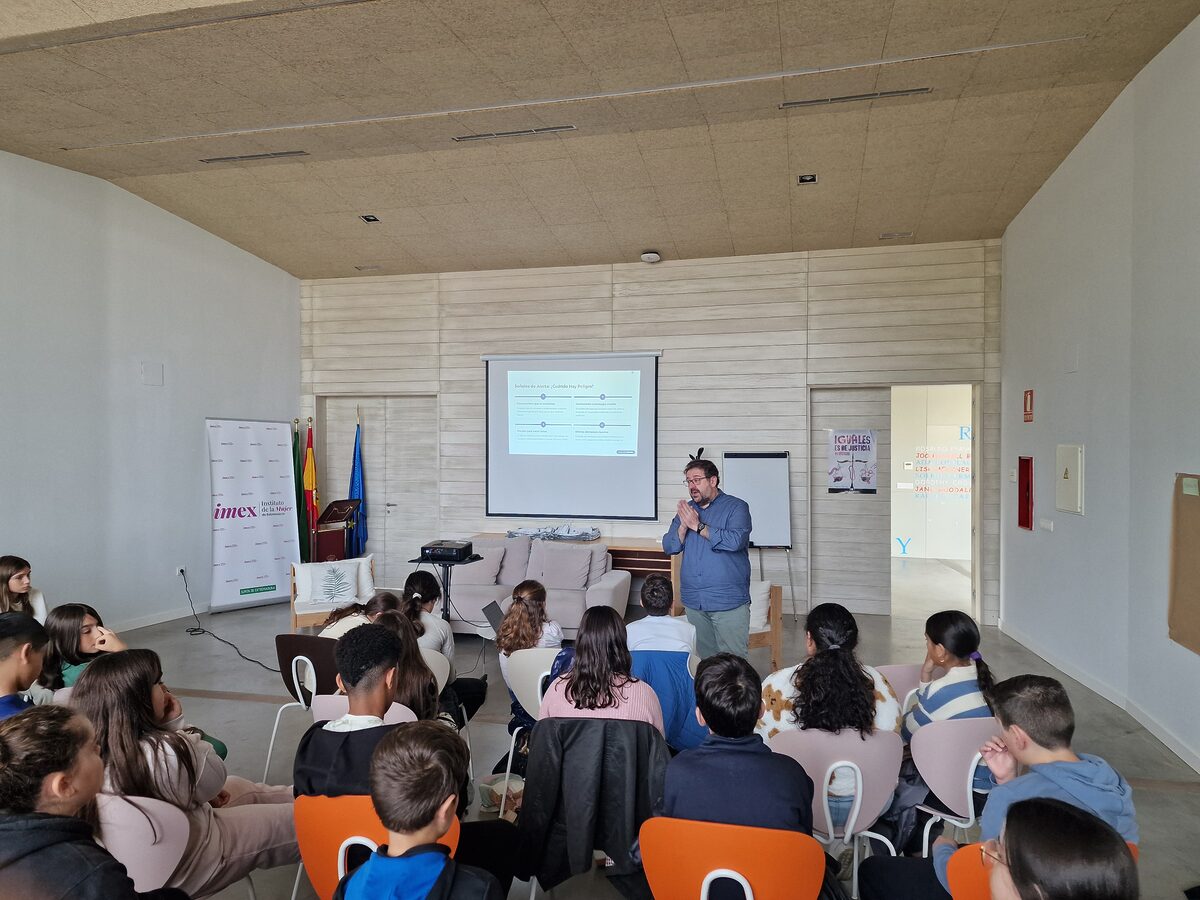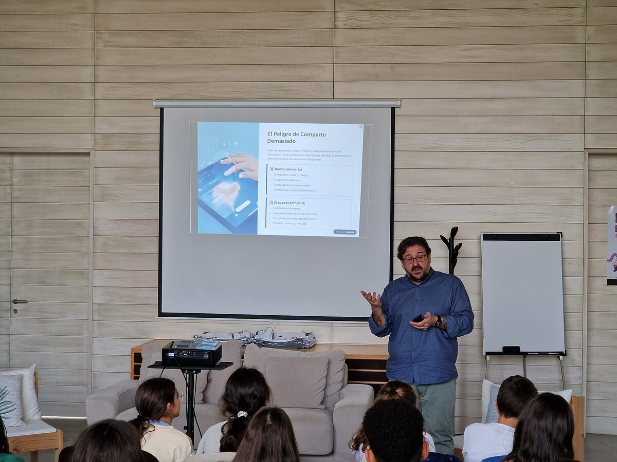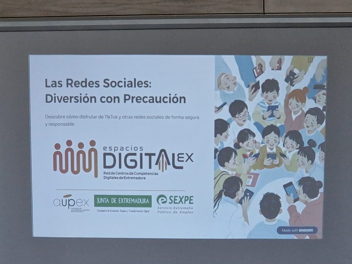 La jornada continuó con una charla sobre el uso responsable de Internet y las redes sociales, impartida por un técnico de Espacios Digitalex, dentro de la Red de Centros de Competencias Digitales de Extremadura (AUPEX, SEXPE y Junta de Extremadura). Bajo el título “Las redes sociales: diversión con precaución”, el alumnado aprendió a identificar los riesgos de compartir información personal, a reconocer señales de alerta en la red y a mantener una actitud segura y responsable en el entorno digital.